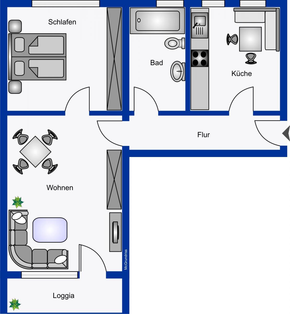 Die Eigentumswohnung befindet sich im 1.OG eines gepflegten Mehrfamilienhauses mit insgesamt 9 Wohneinheiten und verfügt über ca. 58 m² Wohnfläche, die sich wie folgt aufteilt: Diele, Küche, Badezimmer, Wohnbereich, Schlafzimmer, Loggia mit Süd-Ausrichtung