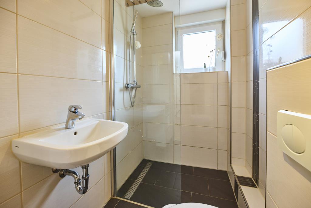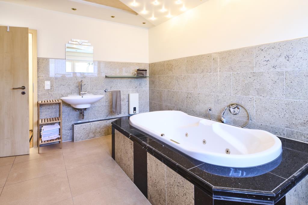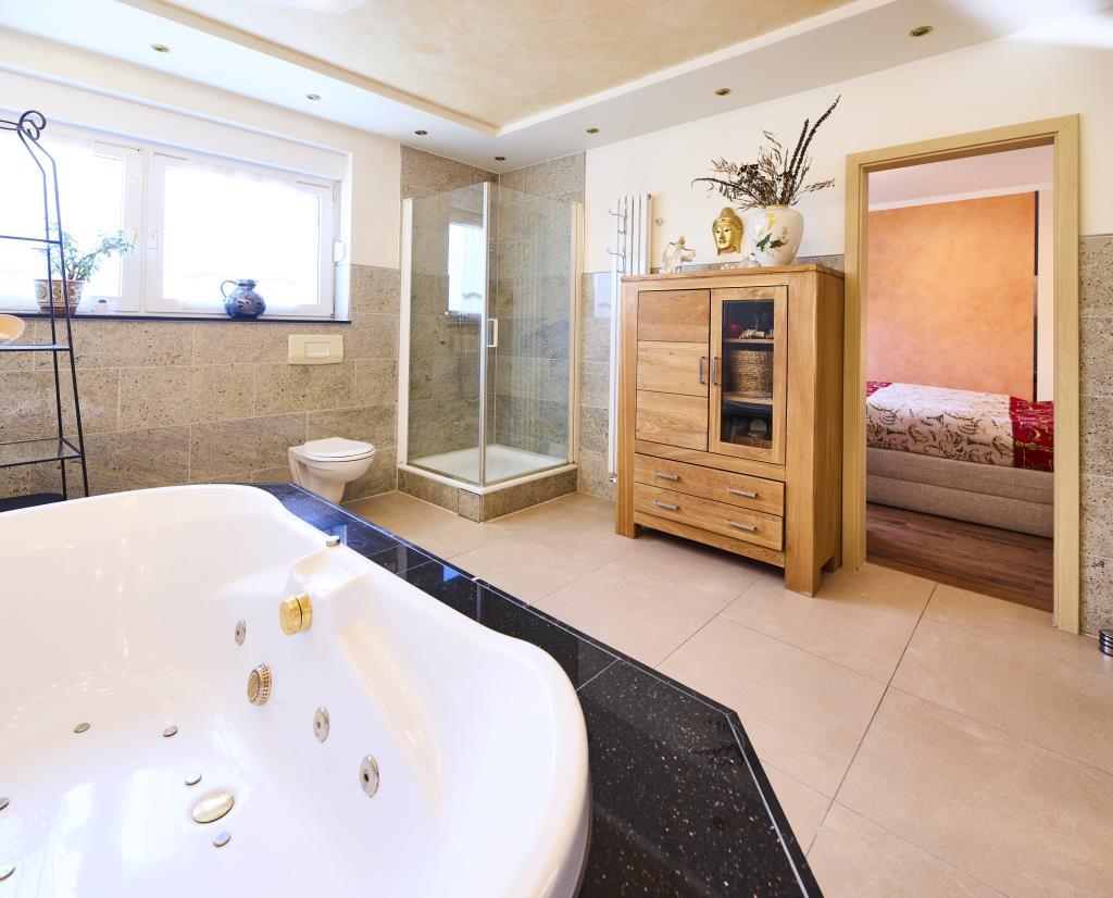 1 Schlafzimmer zur Gartenseite mit Bad En Suite als großes Tageslichtbad mit Wanne und Dusche